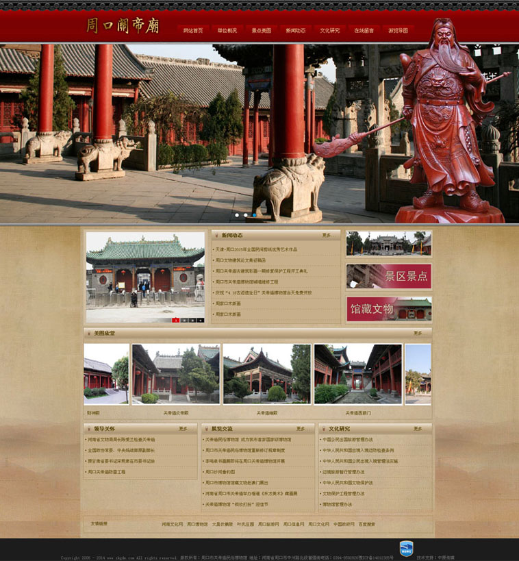 周口關帝廟位于周口市富強街,座北面南,始建于清康熙三十二年,(公元1693年),后經(jīng)雍正、乾隆、嘉慶、道光年間屢次擴建、重修,于咸豐二年(公元1852年)全部落成,歷時159年。整個廟宇為三進院落,占地約36000多平方米,現(xiàn)存樓廊殿閣140余間。整個古建筑群為仿宮殿式,布局嚴謹,巍峨壯觀,裝飾富麗,工藝精湛。山門、鐵旗桿、饗殿、大殿、戲樓、拜殿、春秋閣由南向北,依次建于中軸線上;藥王殿、灶君殿并東廊房,財神殿,酒仙殿并西廊房輝映于前院左右;東西看樓、東西廡殿建于中院兩側;老君殿、馬王殿、瘟神殿居于東偏;僧舍客房則位于西院。是全國關帝廟建筑中規(guī)模較大,石雕、木雕雕刻藝術價值最高,保存最為完整的古建筑群。廟內環(huán)境清幽,殿堂秀麗,是全國重點文物保護單位,國家AAA級旅游景區(qū)。